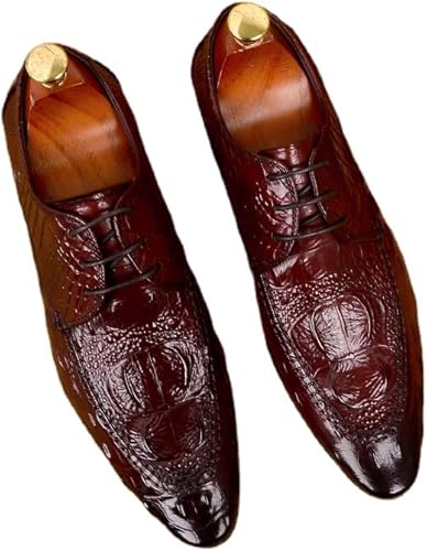 Men Oxford Shoes Lace Up Pointed Toe Block Heel Crocodile Texture Premium Genuine Leather Black Brown Burgundy