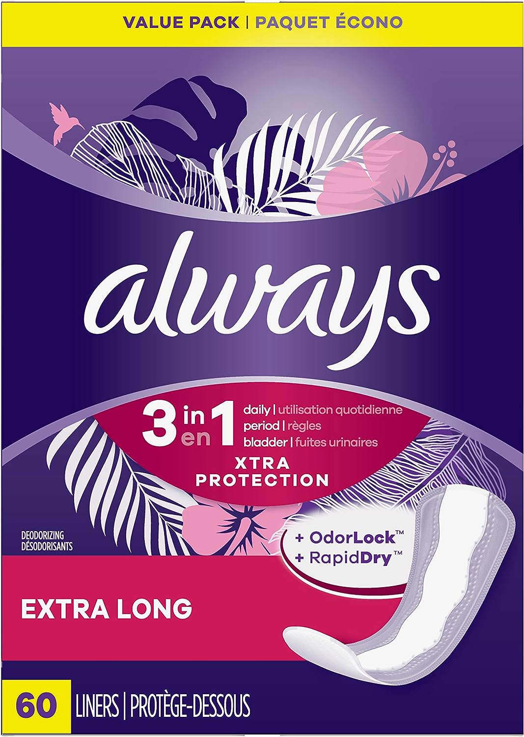 Looking for all-day freshness no matter how you move? Always Xtra Protection 3-in-1 Dailiy Liners Extra Long help keep you dry from daily discharge, period leaks, and light incontinence for a fresh and clean feeling. These daily pantiliners absorb leaks in seconds, while the LeakGuards help keep wetness from the sides, so you can feel confident. Always 3-in-1 Daily Liners absorb 8X more to keep you protected for daily, period, and bladder (vs. Always Thin Daily Liners), and have Edge-2-Edge Adhesive helps keep the panty liner in place. Remeber to use the Always Liners Fit sizing chart so you can find your best fit, since Always offers a wide range of liners to meet your needs.Always Feminine Products are now HSA/FSA-Eligible in the US.Frequently Asked QuestionsWhy should I wear panty liners?Panty liners protect your underwear and help you stay fresh and clean, no matter if it's against irregular periods or everyday vaginal discharge.How do I find the right panty liner?Always panty liners come in different lengths and absorbencies. Check the comparison chart above to find the one that fits you best.I am concerned about odor. What is the best liner for my needs?Always 3-in-1 Xtra Protection pantiliners contain odor-neutralizing technology, so you don't need to worry about odors.