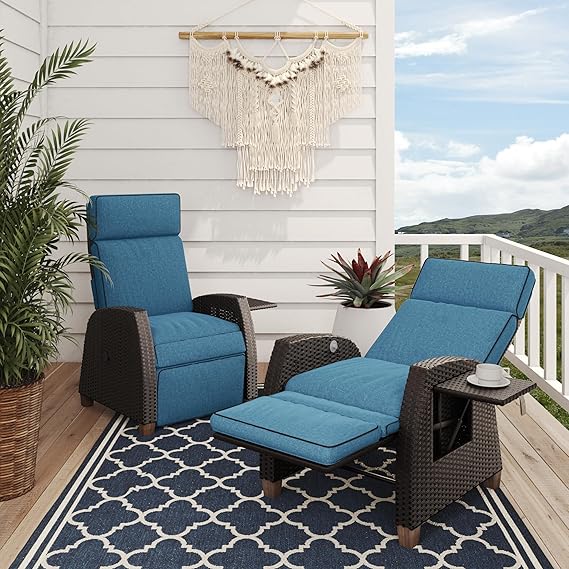 Grand patio Outdoor Reclining Chairs with Extended Footrest 2-Piece Adjustable Patio Wicker Lounge Recliner up to 150Îç with Flip Side Table Peacock Blue