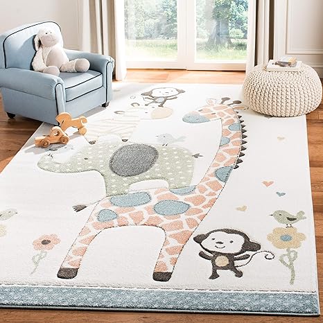 SAFAVIEH Carousel Kids Collection Area Rug - 4' Square, Ivory, Animal Design, Non-Shedding & Easy Care, Ideal for High Traffic Areas for Boys & Girls in Playroom, Nursery, Bedroom (CRK120A)