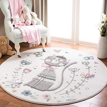 SAFAVIEH Carousel Kids Collection Area Rug - 5'3" Round, Ivory & Pink, Cat Design, Non-Shedding & Easy Care, Ideal for High Traffic Areas for Boys & Girls in Playroom, Nursery, Bedroom (CRK187A)