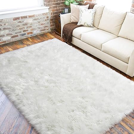 LOCHAS Soft Fluffy Faux Fur Rugs for Bedroom Bedside Rug 4x6 Feet, Washable, Furry Sheepskin Area Rug for Living Room Girls Room, Luxury Shag Carpet Home Decor, White