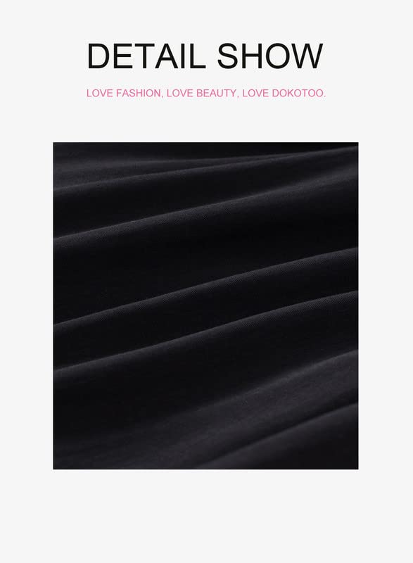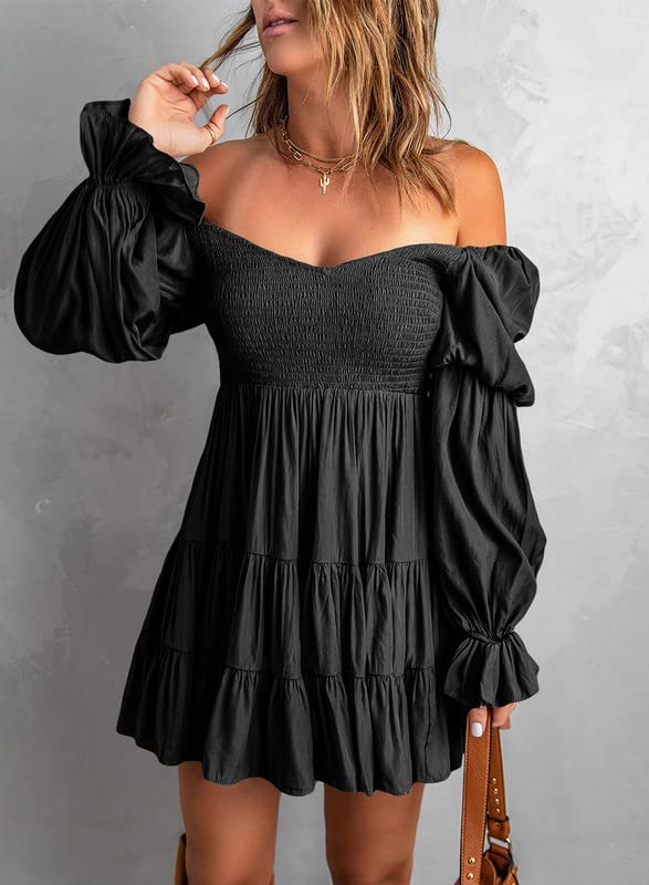 Dokotoo Womens Juniors Cute Spring Casual Summer Dress Sexy Off The Shoulder V Neck Lantern Long Sleeve Ruffle Solid Flowy Empire Waist Mini Short Dress Party Skater Dresses for Women Black Large