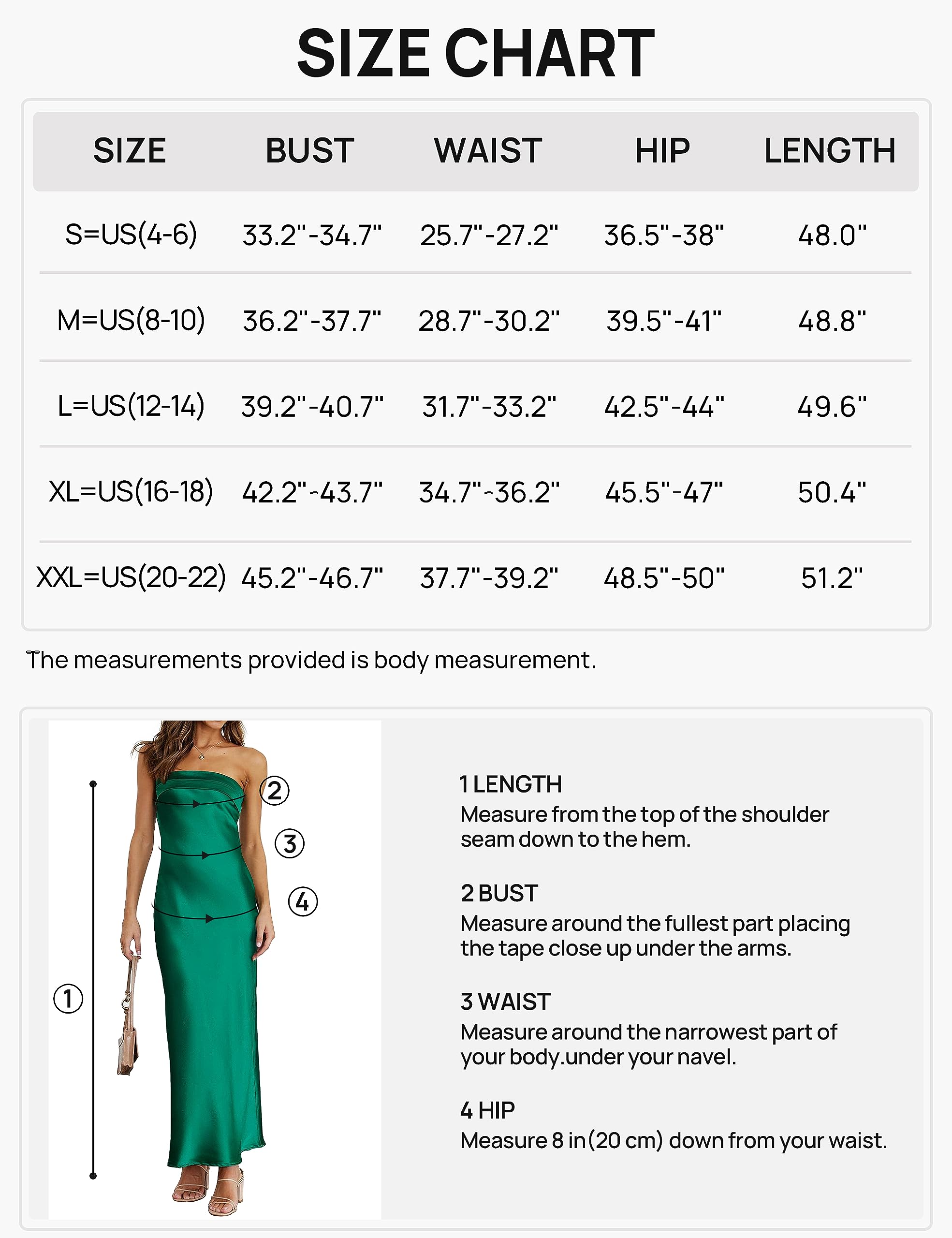 • Features: Solid color, strapless, backless, tube top maxi dress, cutout low back with a folded elastic band, a line, side hidden zipper, double lined in light color, silky, fashionable bodycon party dress.