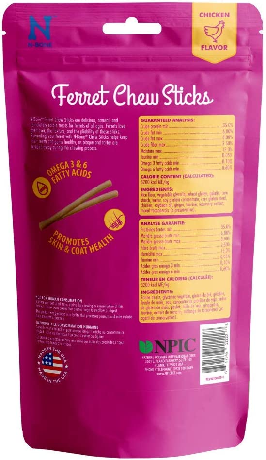 N-bone ferret chew treats are an all natural, edible and digestible chew treat for ferrets of all ages and formulated to be long-lasting.