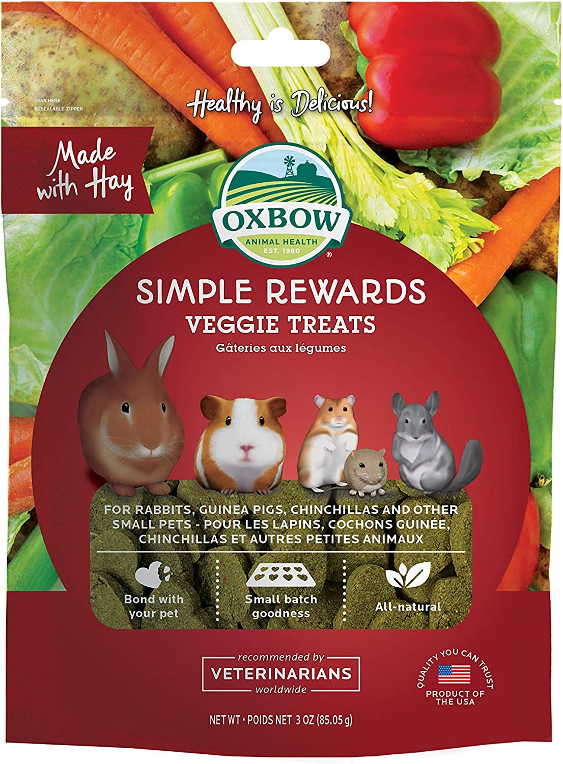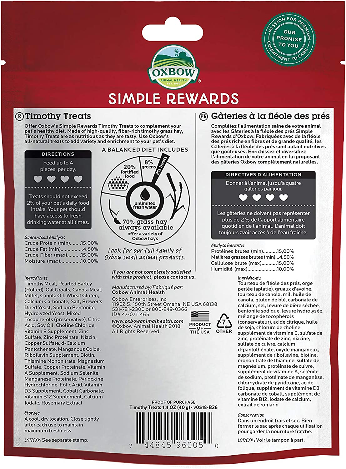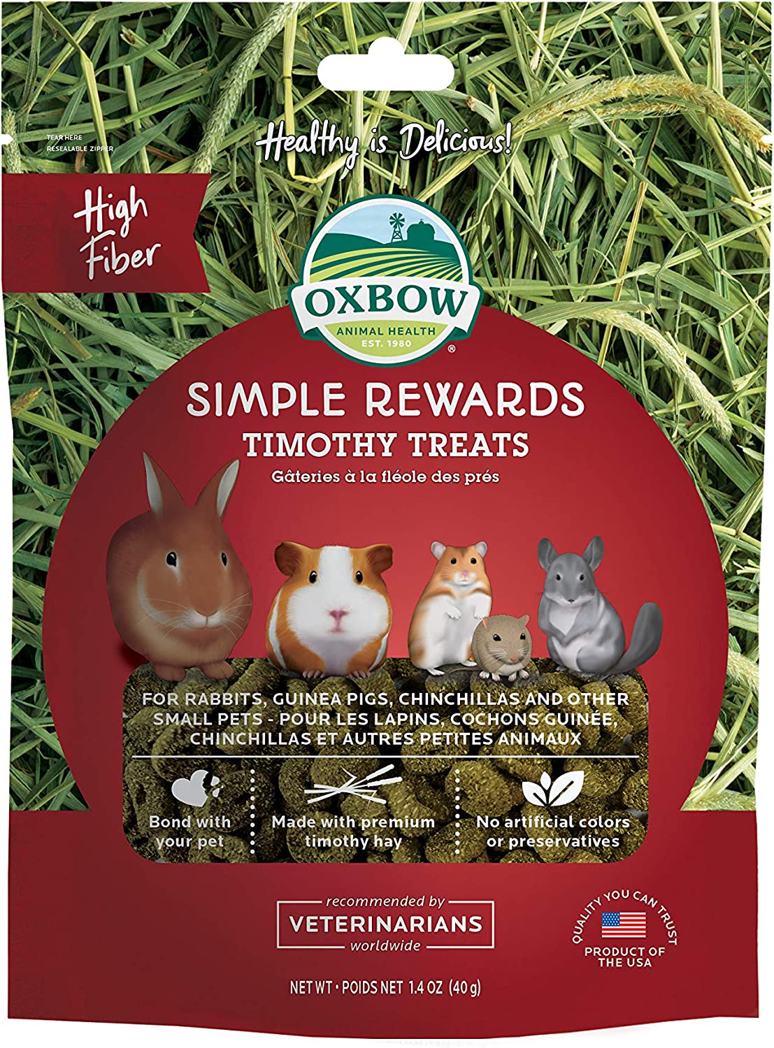 At Oxbow Animal Health, our purpose is to help people and pets live happy, healthy lives. For more than 30 years, we’ve partnered with leading veterinarians and nutritionists to develop nutrition and care products that meet the specific species and life stage needs of rabbits, guinea pigs, chinchillas, hamsters, gerbils, rats, and mice. From farm fresh hays and nourishing fortified foods to wholesome treats, beneficial supplements, enrichment and care, Oxbow products are used and recommended by leading veterinary professionals and passionate pet parents worldwide.Oxbow Simple Rewards Timothy Small Animal Treats are made of high-quality, fiber-rich timothy grass hay which supports healthy digestion, especially in Guinea Pigs, rabbits and chinchillas, with a flavor and aroma small pets love. Reward your small pet and support his digestive health with Oxbow Simple Rewards Timothy Small Animal Treats.