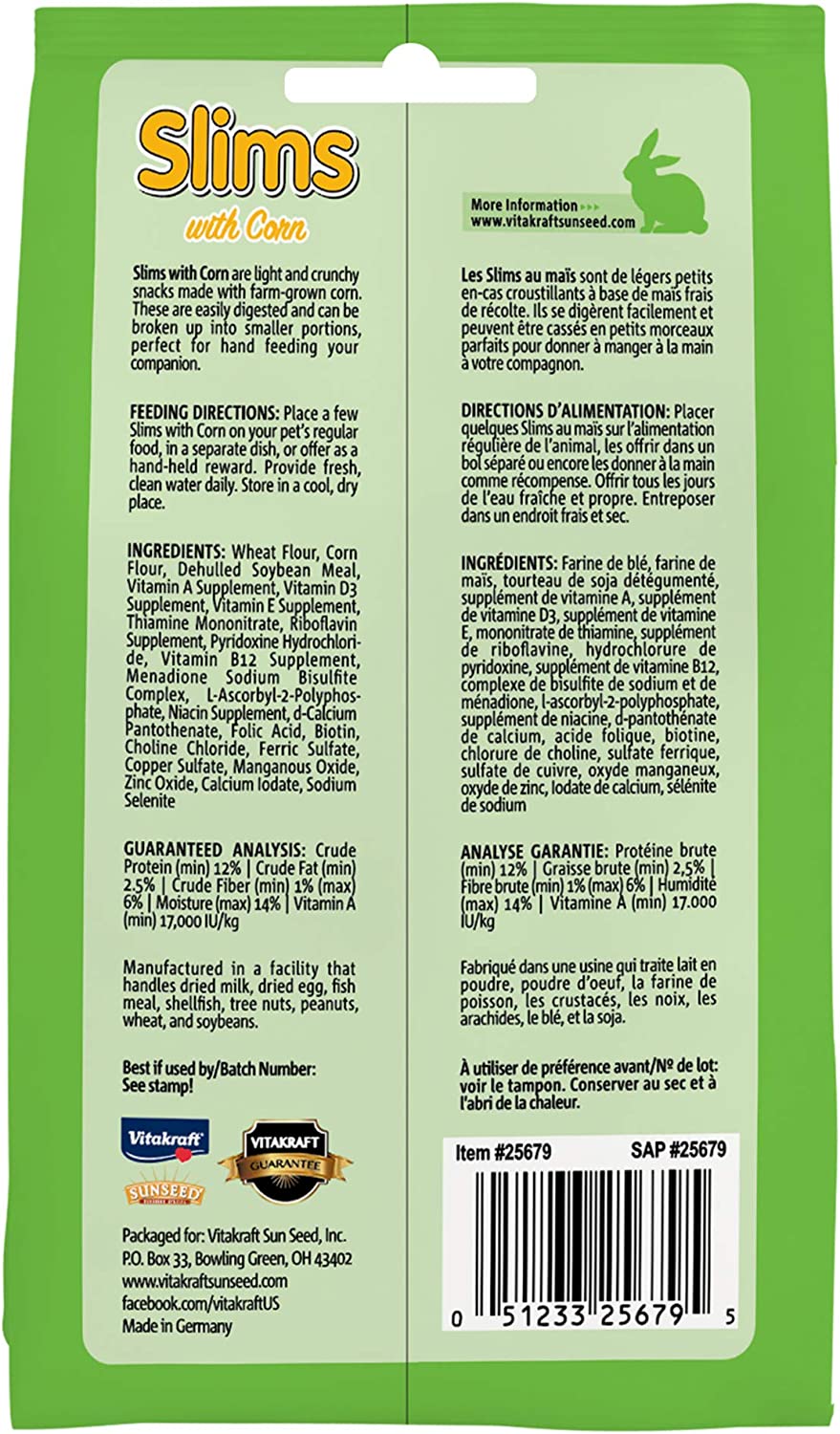 Vitakraft's Slims are rabbit treats for bunnies that love an alfalfa-flavored crunch, or for hamsters or guinea pigs who crave a crispy snack. These treats feature alfalfa hay for rabbits and other small animals, and have all of the goodness of real vegetables and whole grains. A great addition to your regular bunny food and other rabbit supplies. No matter what your small pet eats, Slims are perfect for all the diets under the sun.