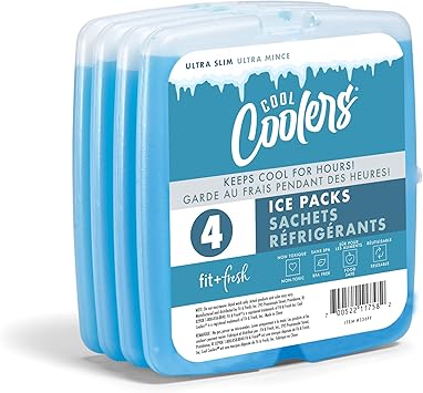 Cool Coolers By Fit & Fresh 4 Pack Slim Ice Packs, Quick Freeze Space Saving Reusable Ice Packs for Lunch Boxes or Coolers, Blue