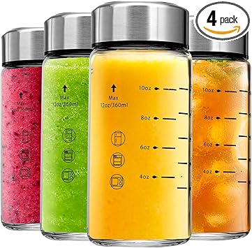 Glass Juice Bottles 4 Pack 12 oz - Wide Mouth Glass Water Bottles with Lids - Borosilicate, Stainless Steel Lids for Juicing, Smoothies, Infused Water, Beverage Storage, Leakproof, Reusable, BPA Free