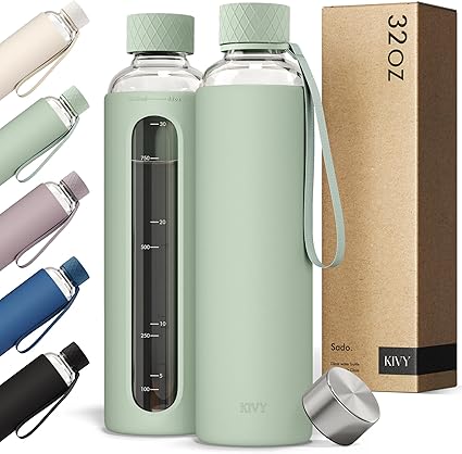 KIVY Glass Water Bottle with Silicone Sleeve 32 oz [WITH MEASUREMENT] - Borosilicate Glass Water Bottle Screw Top - Clear Bottles with Measurement Marking - Sage Green Waterbottle