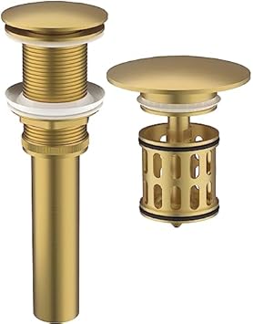 Bathroom Pop up Drain Without Overflow, Anti-Clogging Vessel Sink Drain Strainer, Pop Up Drain with Detachable Basket, Hair Catcher Bathroom Sink Drain Stopper(Brushed Gold, No Overflow)