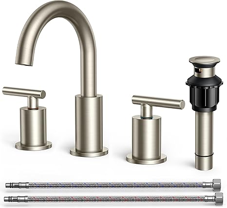 FORIOUS 8 In Widespread Brushed Nickel Bathroom Faucet 3 Hole with Metal Pop Up Drain and 24 Inch Supply Hose, 2 Handle 3 Hole Vanity Faucet for Bathroom Sink Brush Nickel with 360 Degree Swivel Spout