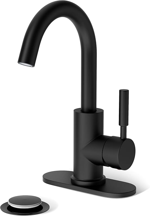Phiestina Single Hole Matte Black Single-Handle High-Arc Stainless Steel Faucet for Pre-Kitchen Sink/Bar Sink/Bathroom Sink, with 4 Inch Deck Plate and Supply Hoses, Matte Black, WE08E-MB