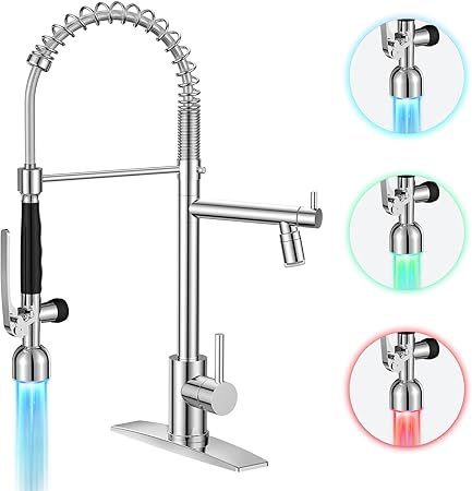 FORIOUS LED Kitchen Faucets Commercial Chrome, High Pressure Classic Pull Down Sink Faucet with Led Light Sprayer Double-Headed Stainless Steel for Restaurant Bar Laundry