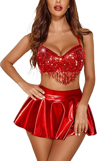 Avidlove Rave Outfits for Women Sequin Fringe Outfits Cosplay Lingerie 3pack Costume Set with Metallic Skirt