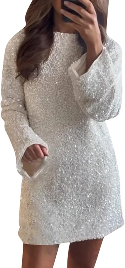 Women's Dresses 2024 Round Neck Long Sleeve Sparkling Sequin Dress Backless Bow Sexy and Cute Party Dress, XS-XL