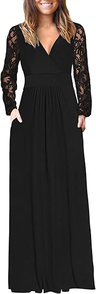 AUSELILY Womens Long Sleeve Maxi Dress 2024 Fall Lace Sleeve Dress V Neck Wrap Waist Long Dresses with Pockets