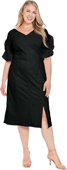 London Times Women's V-Neck Midi Sheath Ruffle Sleeves-Front Slit-Elegant Wedding Guest Cocktail Dress