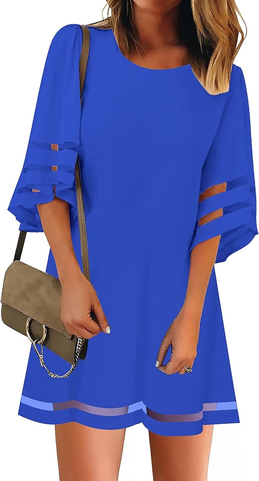 LookbookStore Women Casual Crewneck Mesh Panel 3/4 Bell Sleeve Loose Tunic Dress