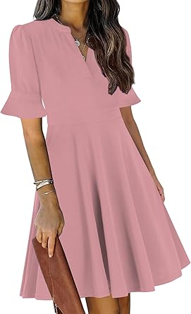Mokayee Womens Summer V Neck Ruffle Short Sleeve Fit and Flare Knee Length Church Wedding Guest Dresses with Pockets