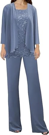 WEEOUR 3 Piece Mother of The Bride Dress Pant Suits for Wedding Guest Chiffon Lace Groom Mother Evening Gown with Jacket