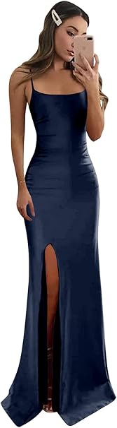 Women's Spaghetti Straps Mermaid Prom Dress with Slit Long Ruched Satin Formal Gowns Evening Dresses