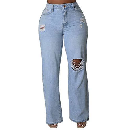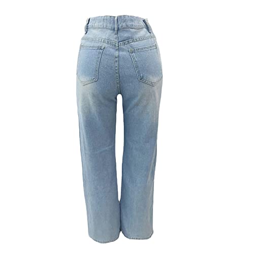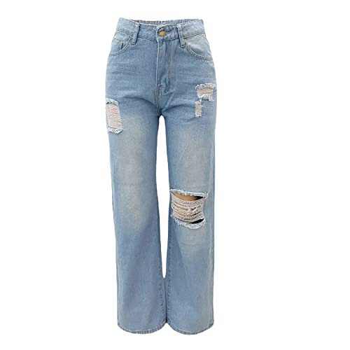 Yenfief Womens Baggy Ripped Straight Leg Jeans High Waisted Distressed Boyfriend Jeans for Women Loose Wide Leg Denim Pants(S, Light Blue)