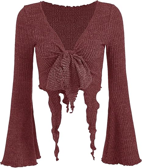 SOLY HUX Women's Long Bell Sleeve Crop Tops V Neck Tie Front T Shirts Sexy Asymmetrical Top Fitted Tees