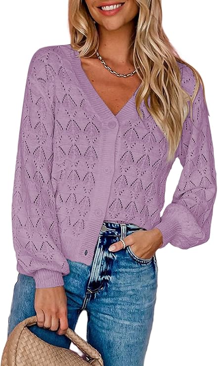 Dokotoo Cropped Cardigan Sweaters for Women Long Sleeve Crochet Knit Shrug Open Front V-Neck Button up Tops