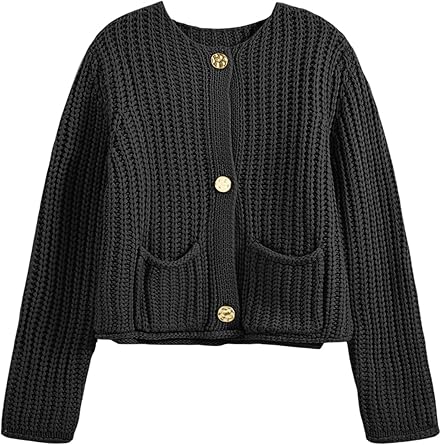 Saodimallsu Womens Button Up Sweaters Fall Chunky Knit Trendy Crewneck Open Front Loose Cardigan with Pockets