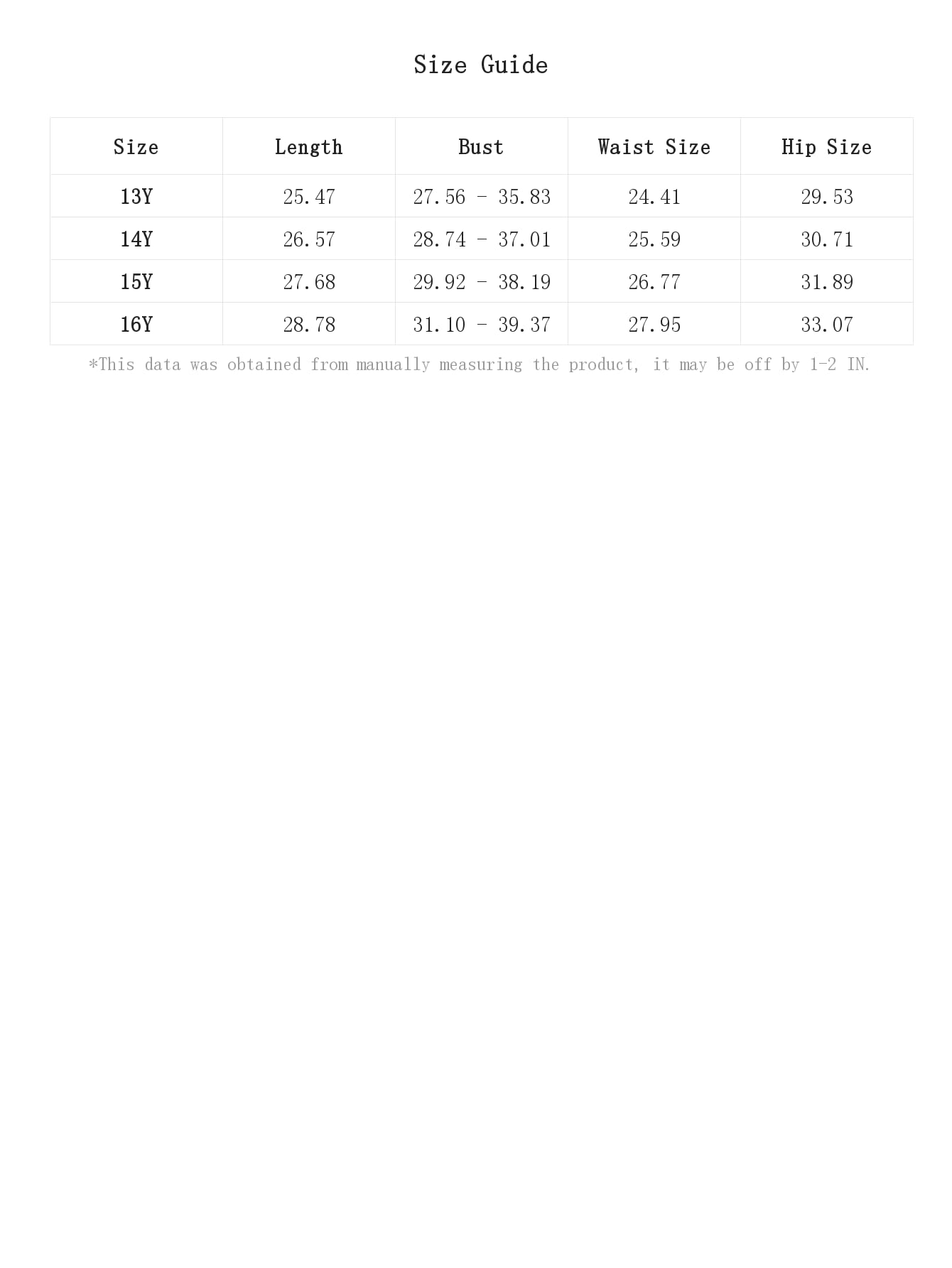 16Y:Bust:31.1-39.4IN,Hip Size:33.1IN,Length:28.8IN,Waist Size:28.0IN