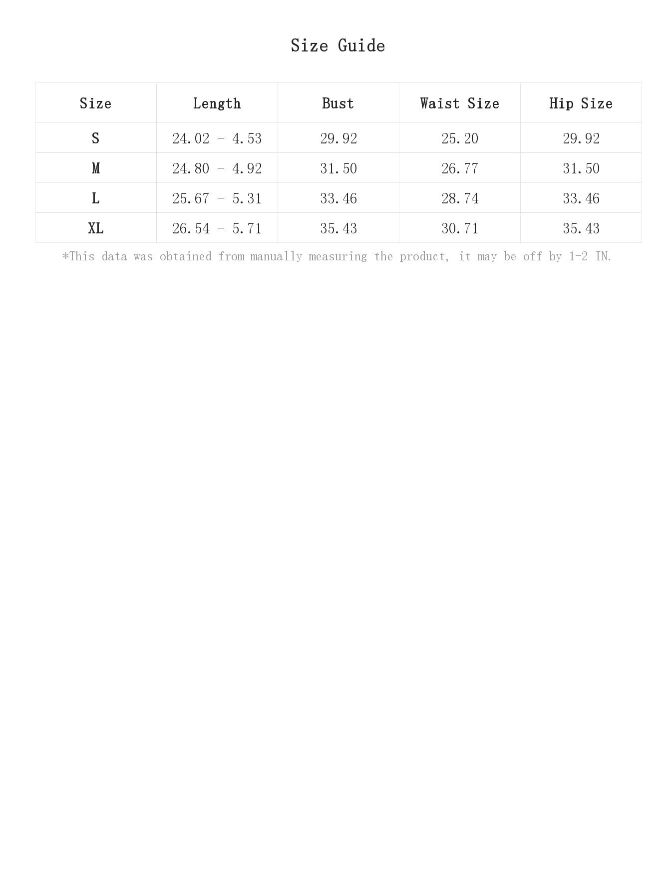 S:Bust:29.9IN,Hip Size:29.9IN,Length:24.0/4.5IN,Waist Size:25.2IN