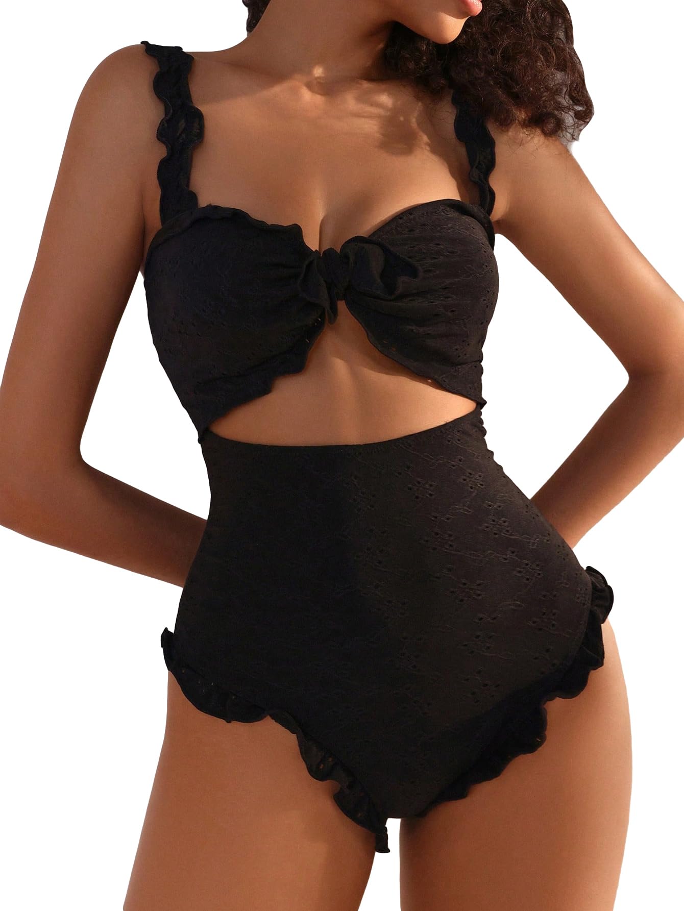 BEAUDRM Women's Solid Cut Out Frill Trim Knot Front One Piece Swimsuit Bathing Suits Swimwear Beachwear Black Small
