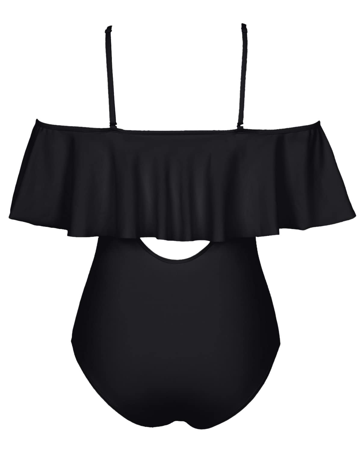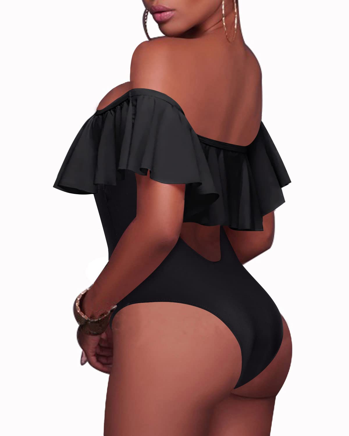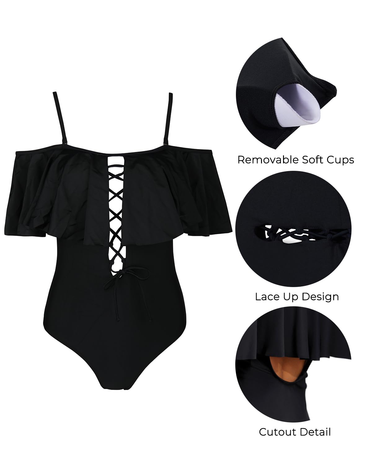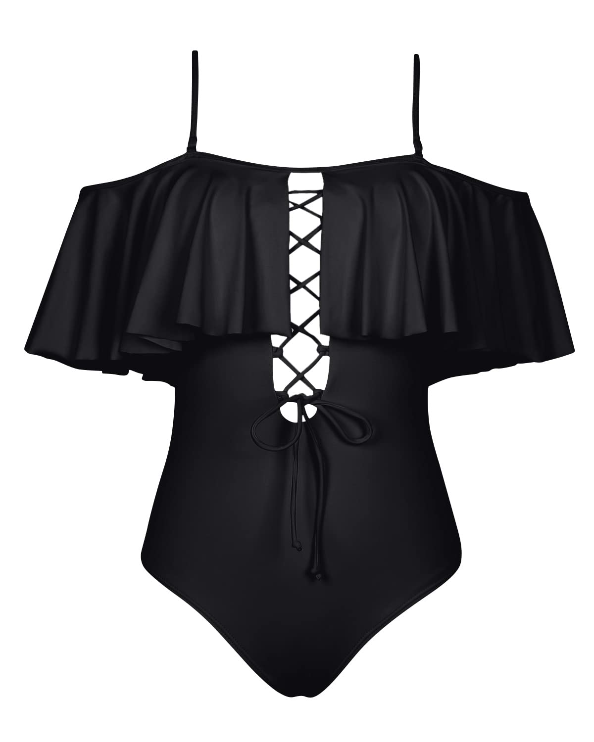 Tempt Me Women Black Sexy One Piece Swimsuit Ruffled Off Shoulder Lace Up Bathing Suit L
