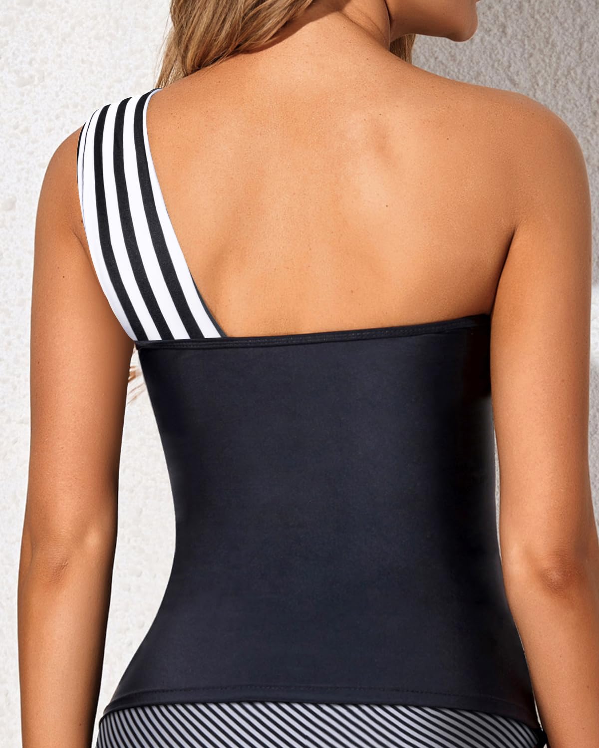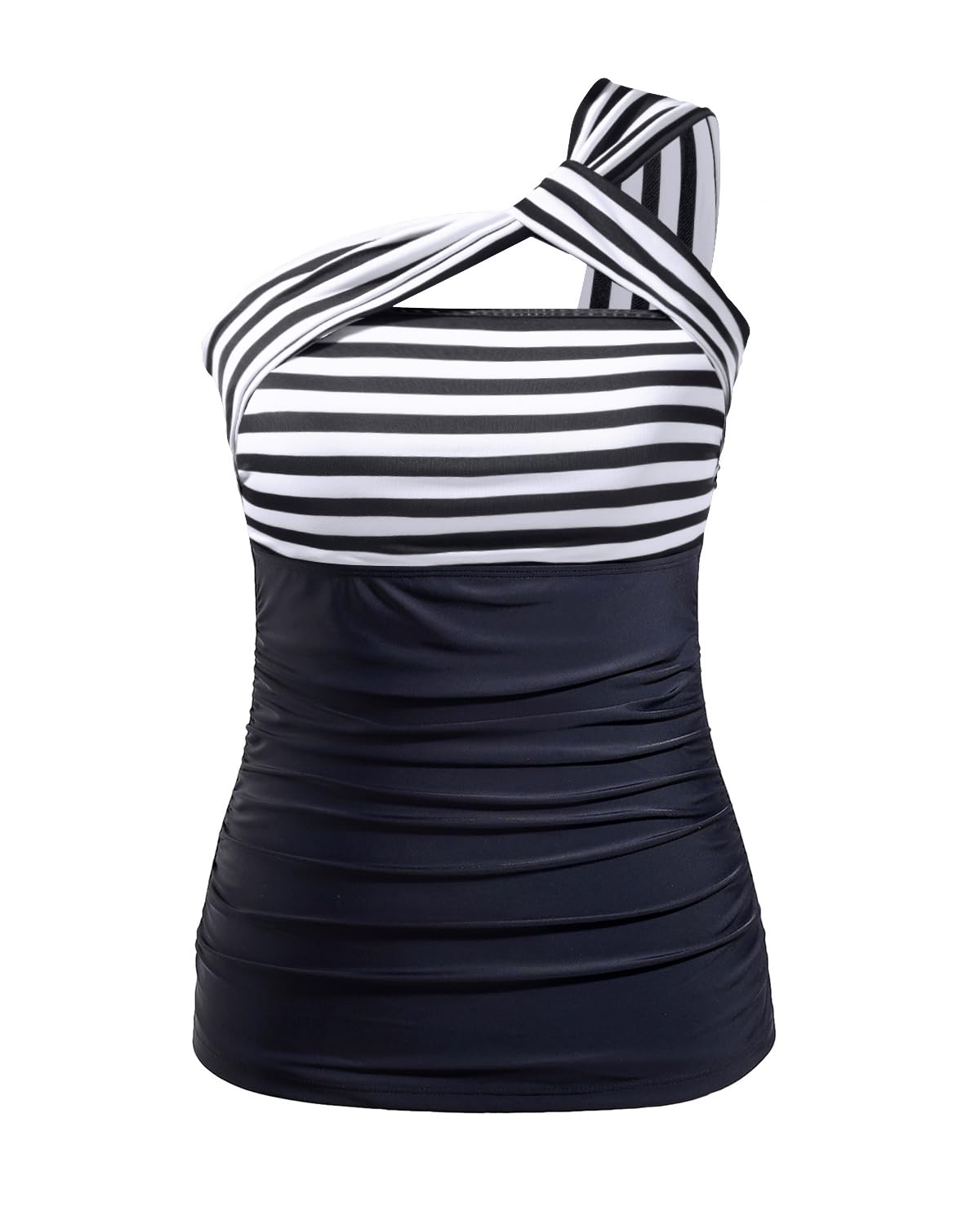 Tempt Me Women Black White Stripe Tankini Top Swim Tops Ruched One Shoulder Bathing Suit Swimsuit Tops Only XXL