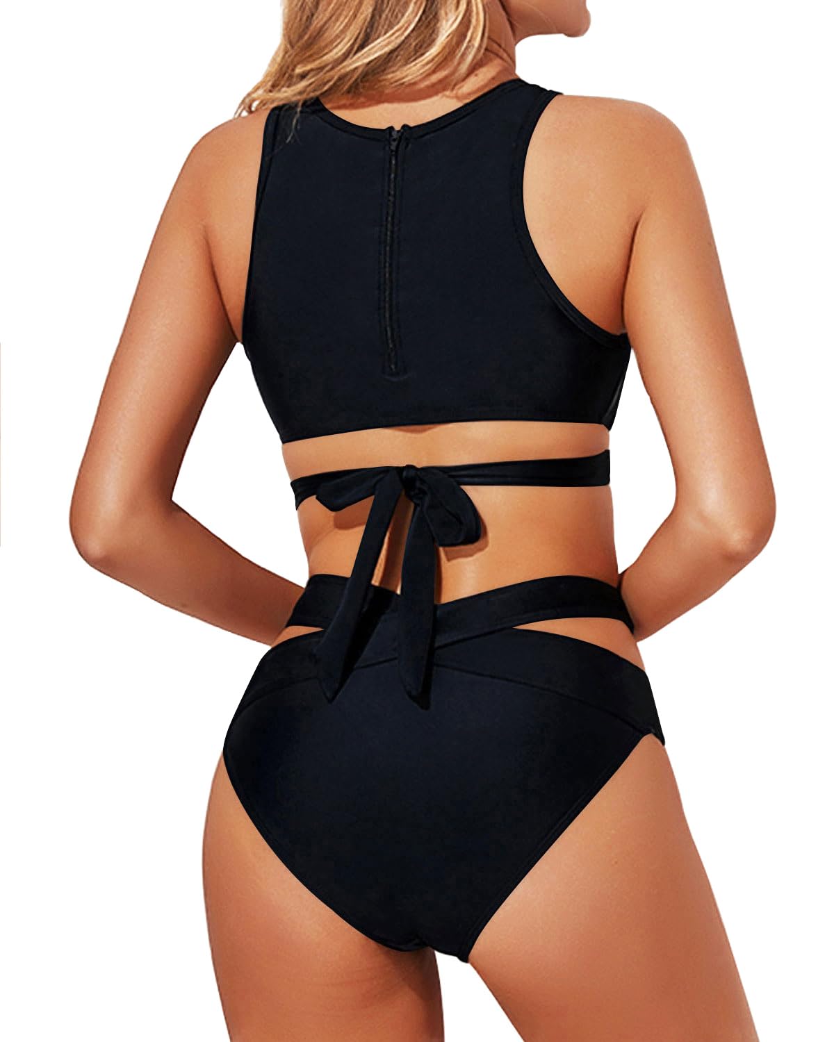Tempt Me Women High Neck Bikini Set Cutout Swimsuit Two Piece Criss Cross Bandage Bathing Suit Black L