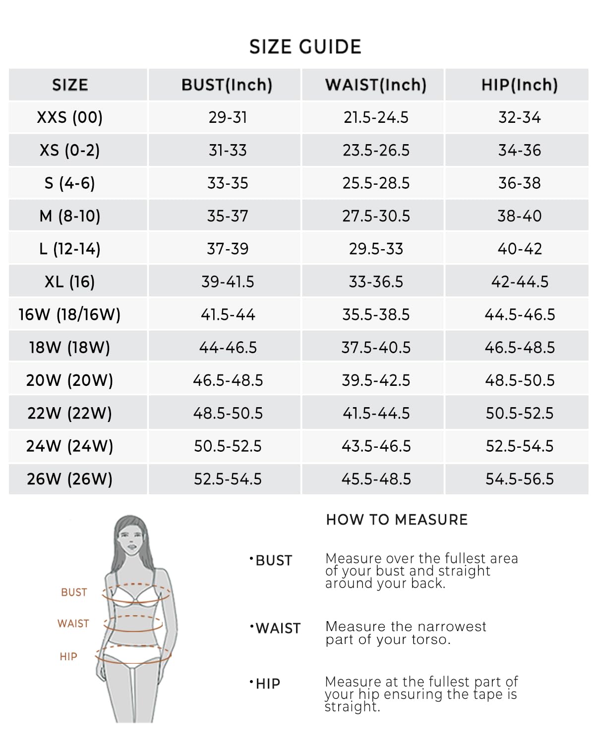 XL(US 16): Bust 42.5", Waist 34", Hip 44.5", Height 5′3"-5′7"