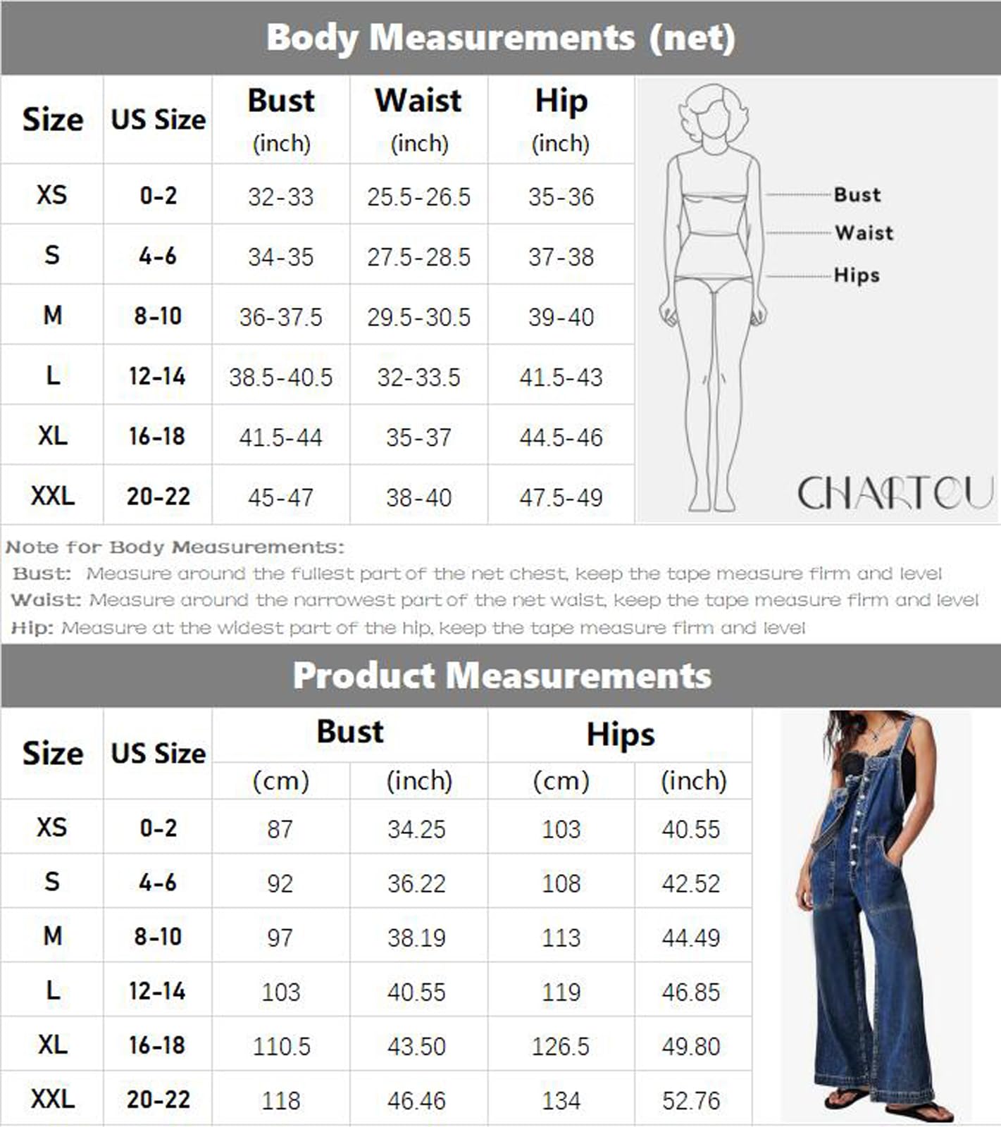 • 【Size Guide for WOMENS OVERALLS】----XS=US 0-2, S=US 4-6, M=US 8-10, L=US 12-14, XL=US 16-18, XXL=US 20-22. Please refer to the body size chart in last picture before purchase.