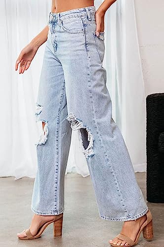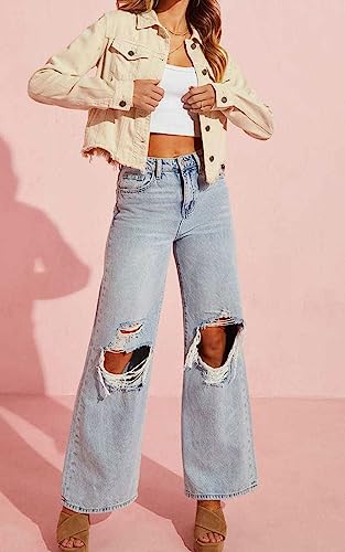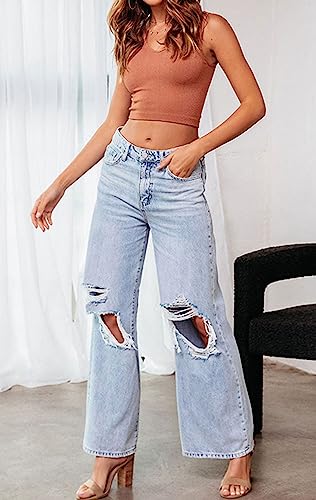 CHARTOU Women Casual Ripped Jeans Distressed Wide Leg Flared Jeans with Holes Destroyed Denim Pants (Medium,Light Blue)