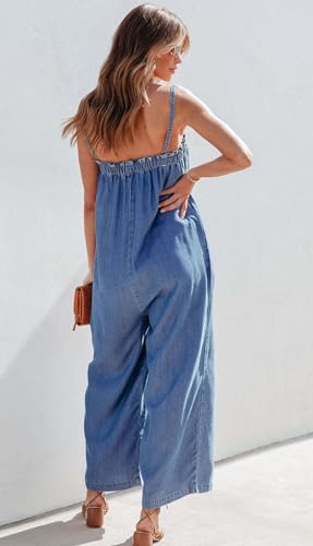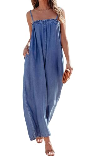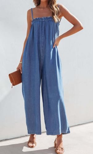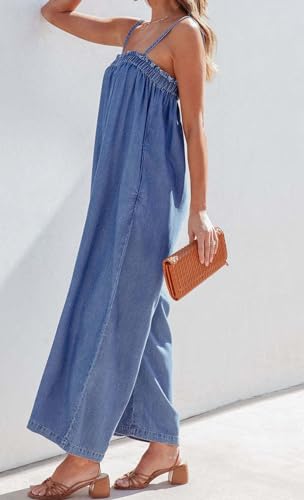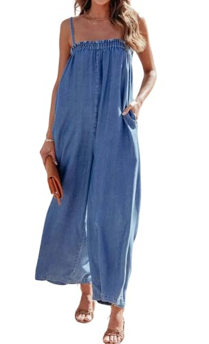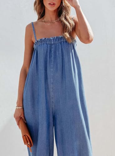 CHARTOU Women Summer Denim Jumpsuit Wide Leg Overall Spaghetti Strap Sleeveless Jean Jumpsuit Long Romper with Pocket (Medium,Blue)