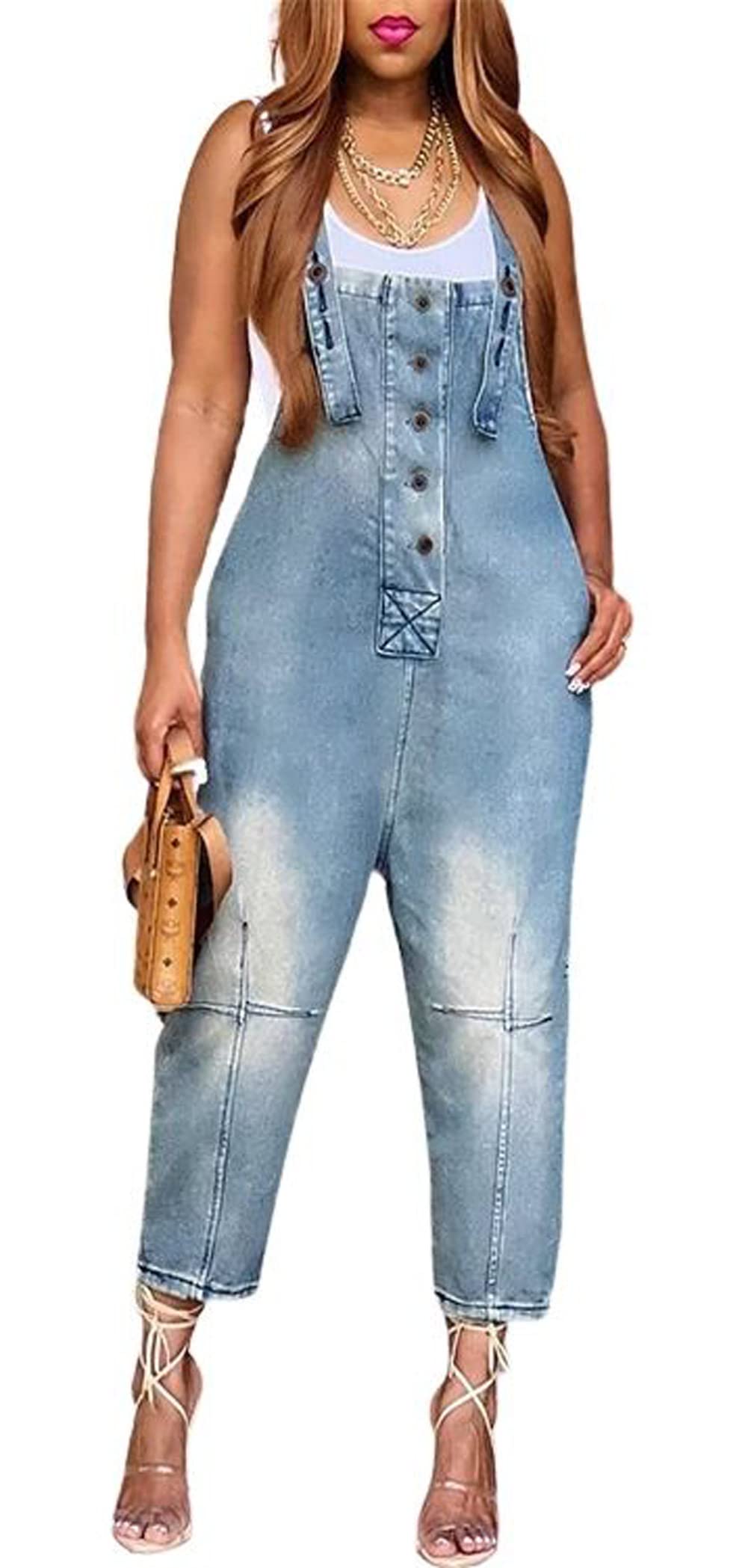 CHARTOU Women's Casual Loose Fit Jean Jumpsuit Overalls Crop Harem Denim Pants (Large, Light Blue)