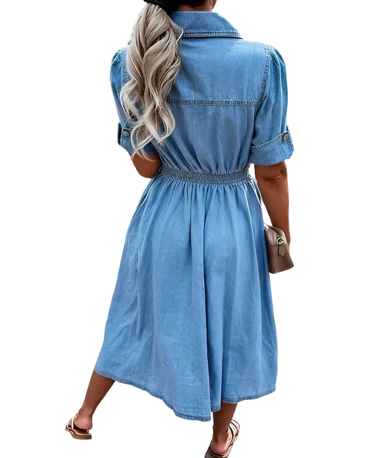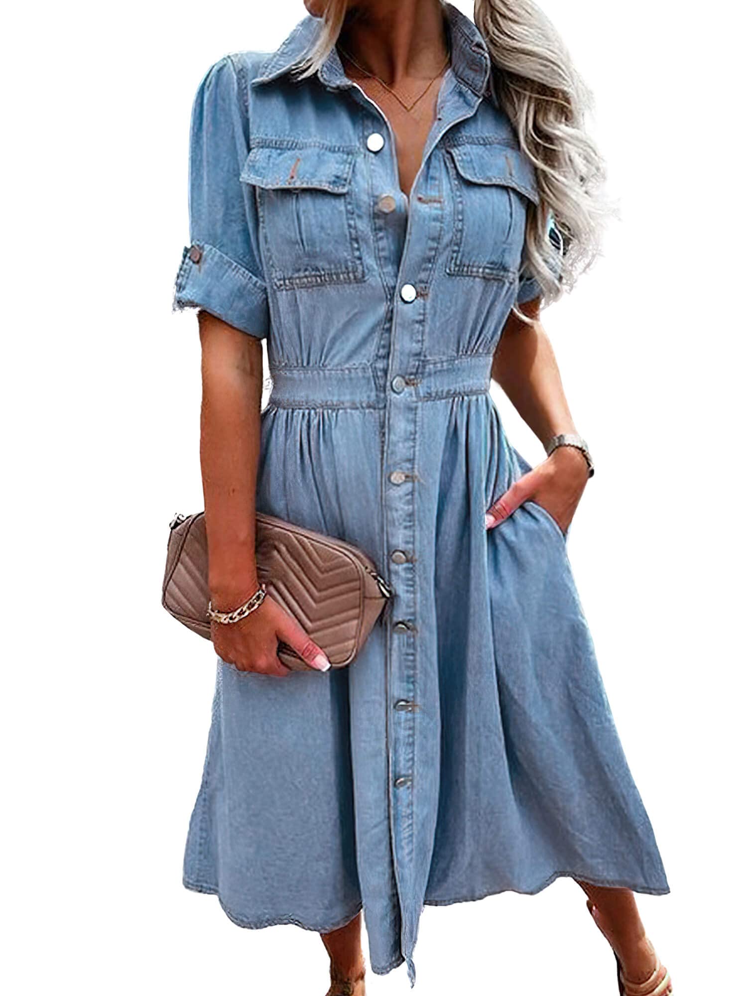 CHARTOU Women's Denim Jean Folded Short Sleeve A-Line Button Down Shirt Dress with Pockets (Large, Light Blue)