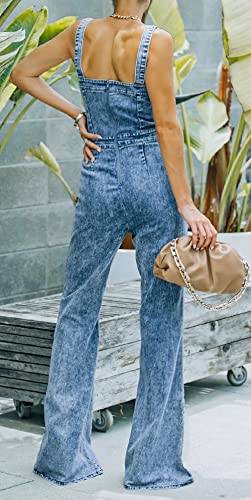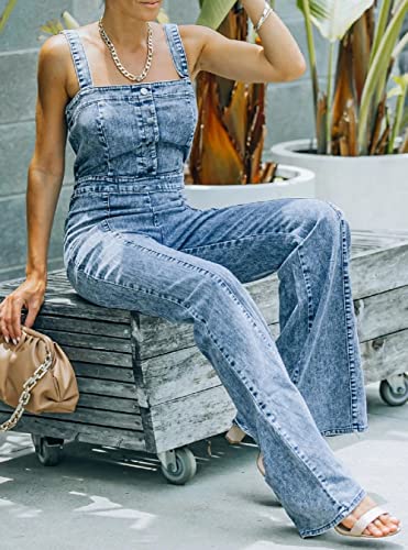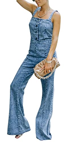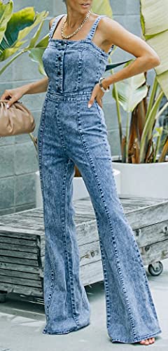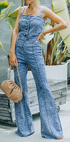 CHARTOU Women's Washed Sleeveless High Waist Flared Bell Bottom Jean Pants Denim Jumpsuits (Blue, Large)