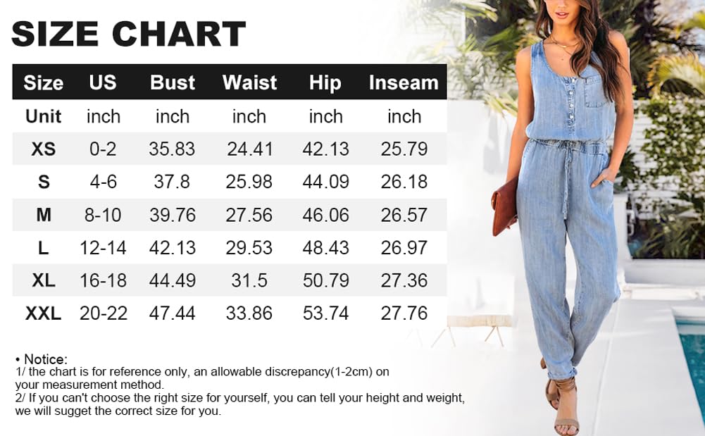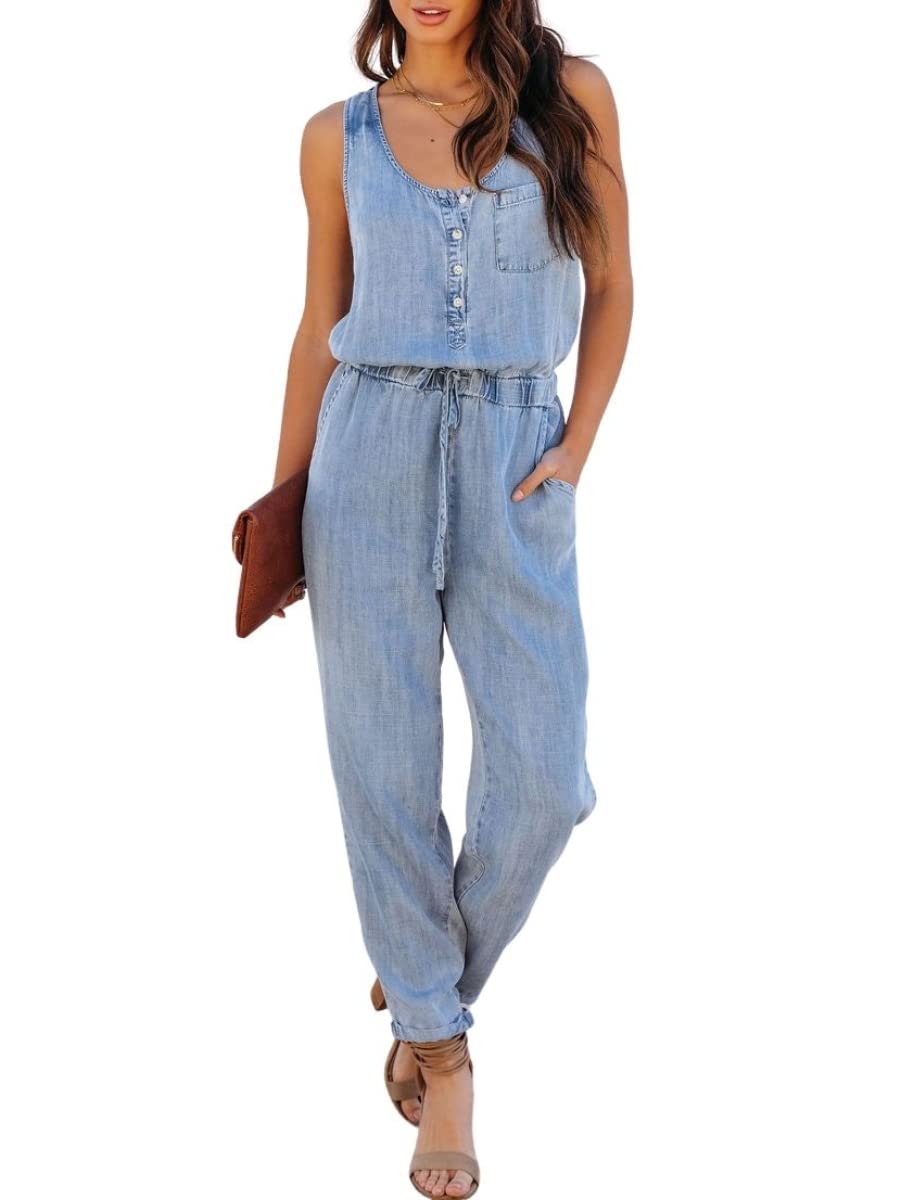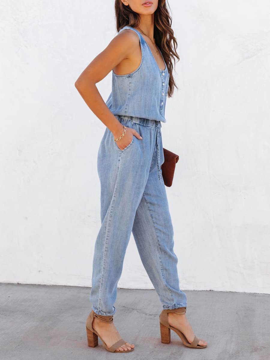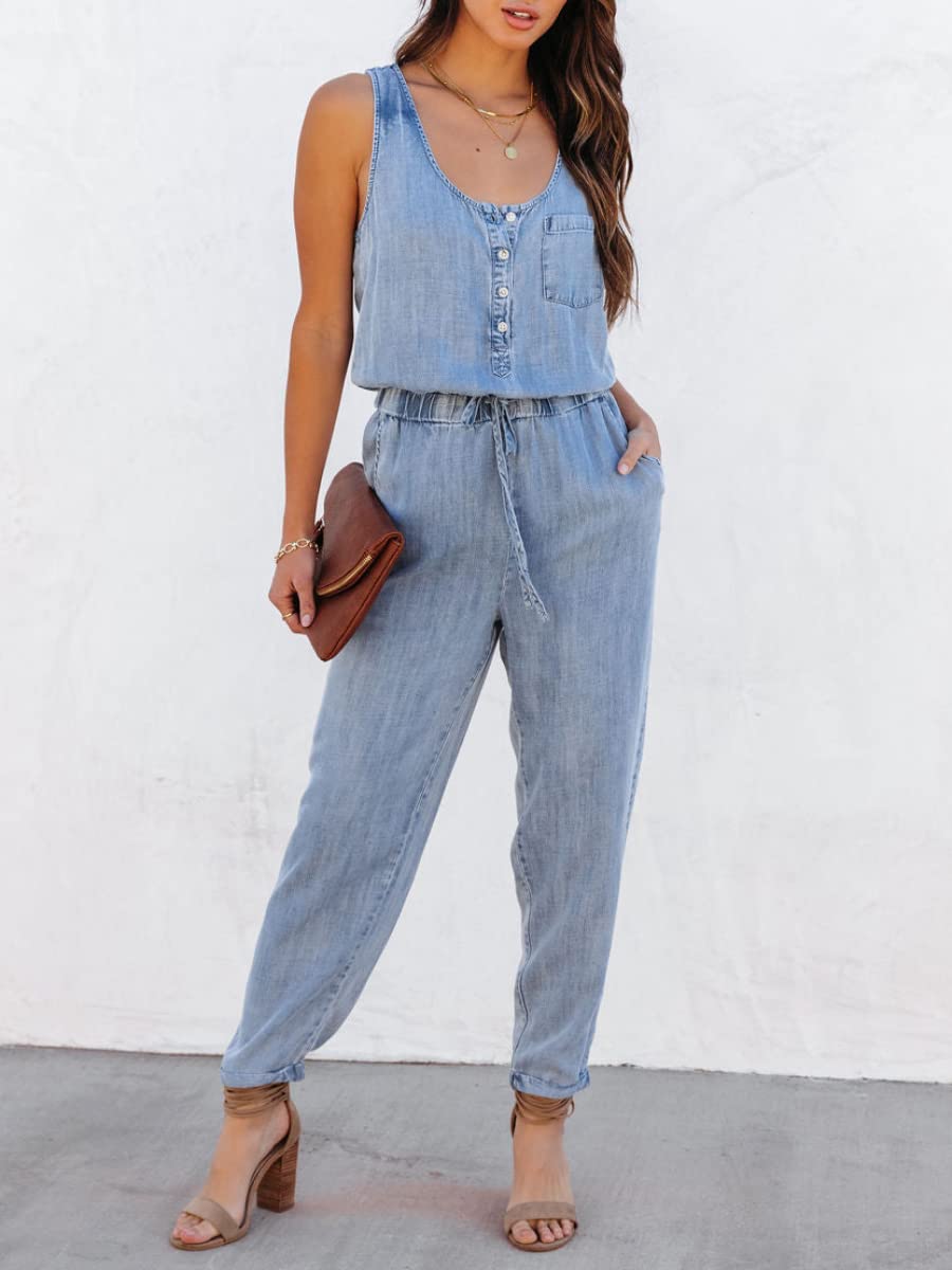 • Retro sleeveless jumpsuit for women, featuring elastic drawstring waist and front button up closure. Made of lightweight and comfy tencel fabric.