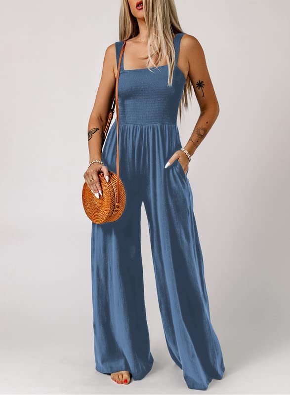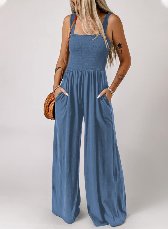Dokotoo Womens Casual Loose Overalls One Piece Sleeveless Jumpsuits for Women Stretchy Wide Leg Long Pant Rompers Jumpsuit with Pockets Small Blue