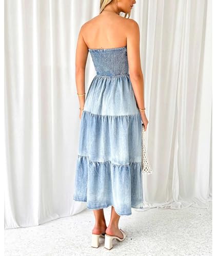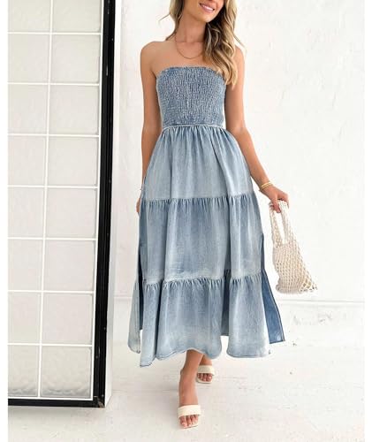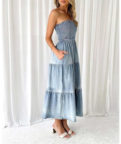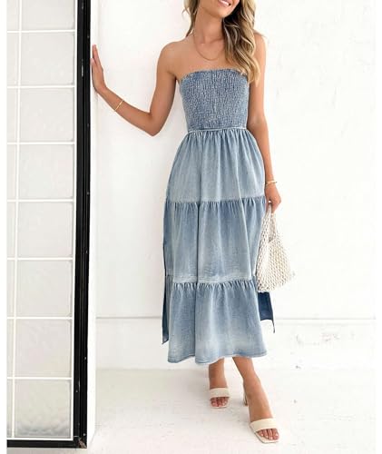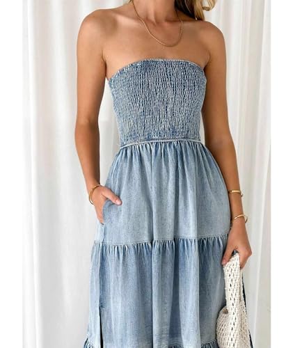 ECDAHICC Women's Summer Strapless Tube Top Sleeveless Split Maxi Dress Boho Casual Denim Loose Long Dress(BE,XL)