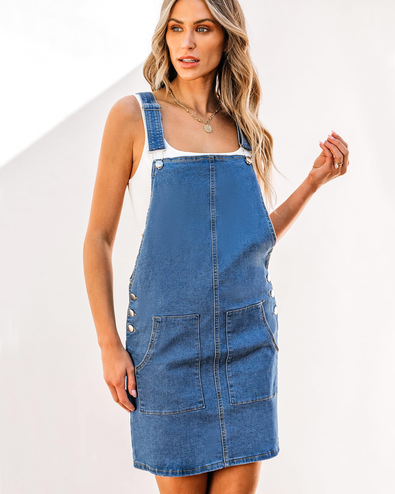 • Denim dress with overall-style, adjustable straps with metal button, you can raise or lower the top on you."