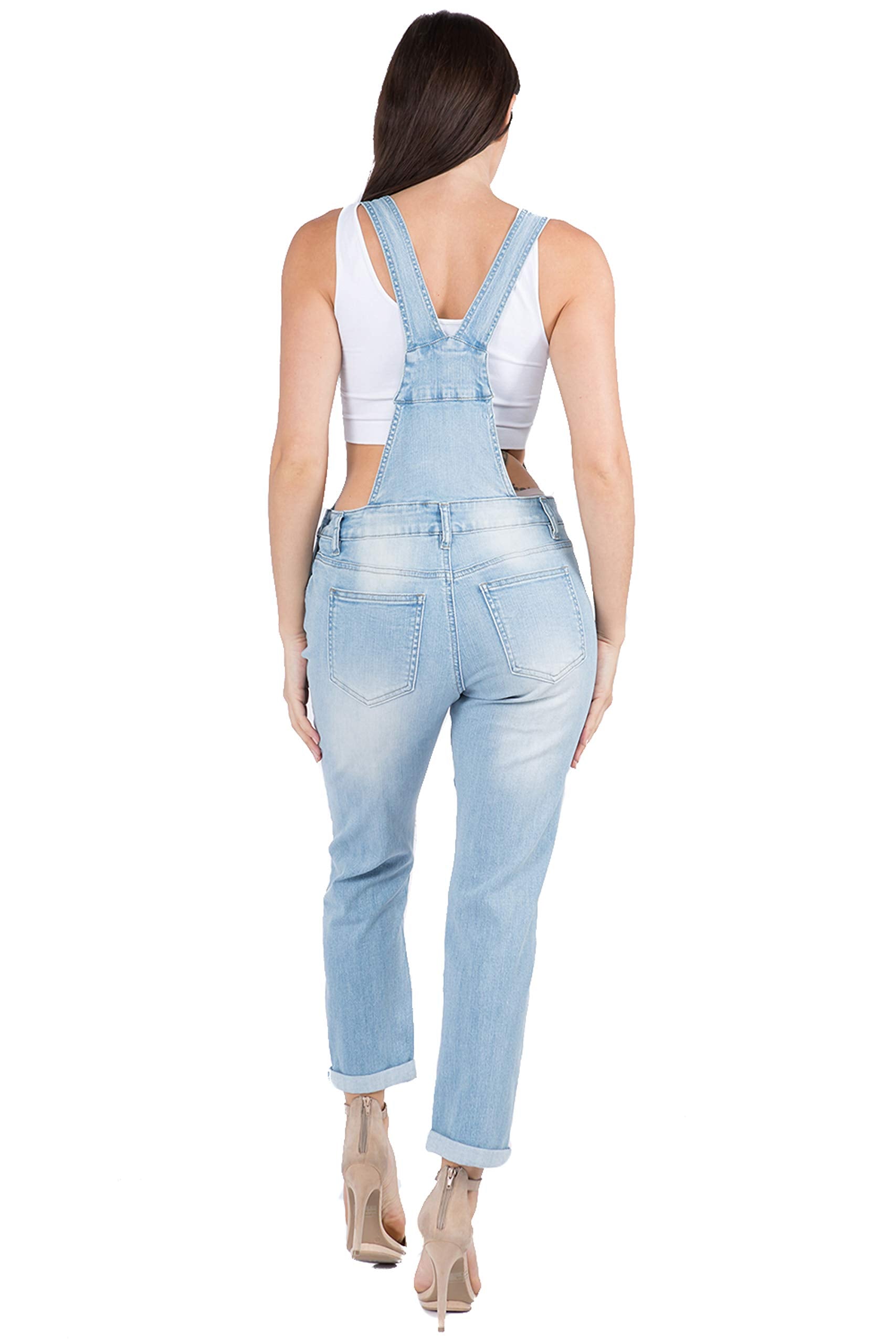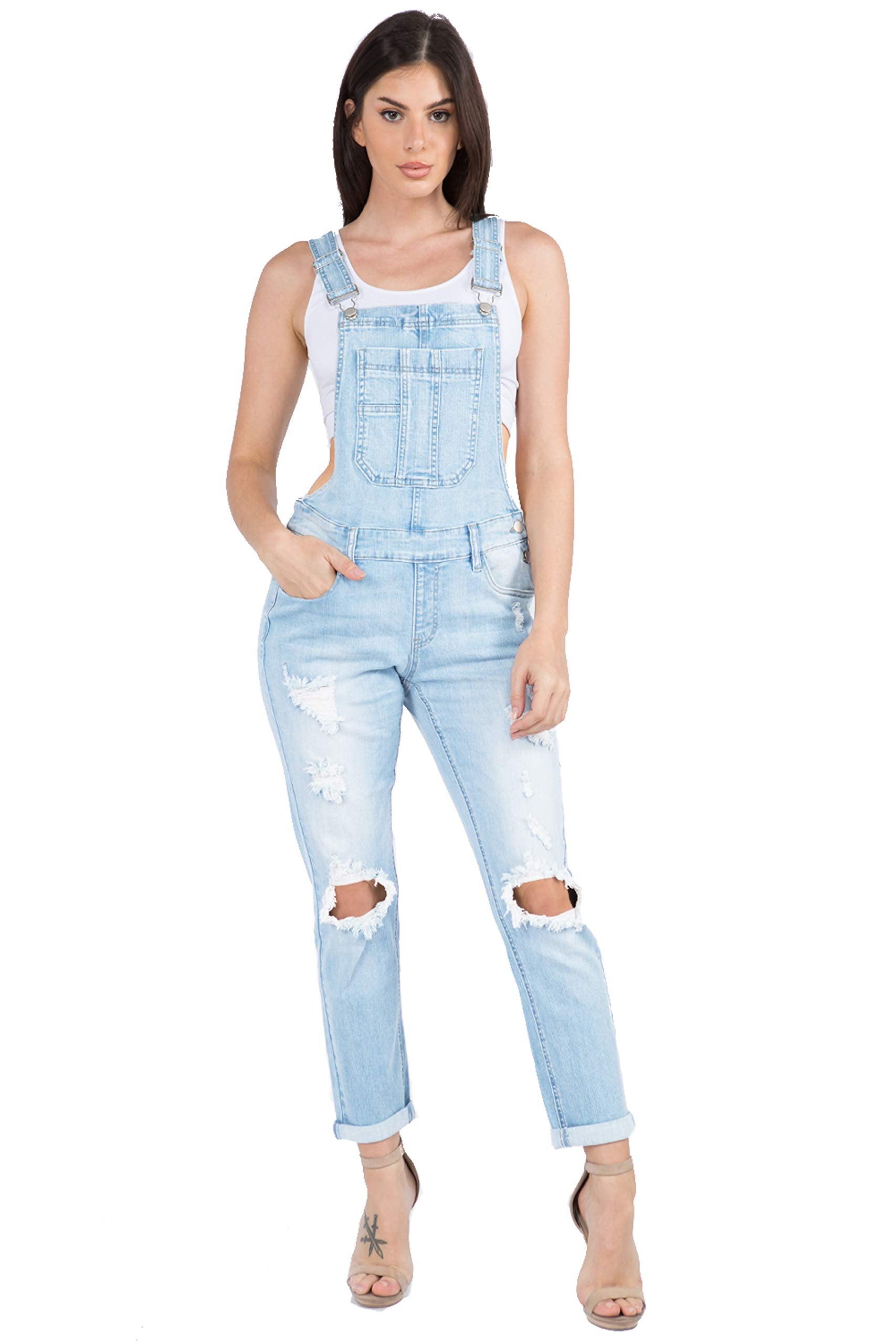 Twiin Sisters Women's Stretchy Ripped Classic Slim Fit Casual Bib Jumpsuit Denim Overalls for Women - Large, Black