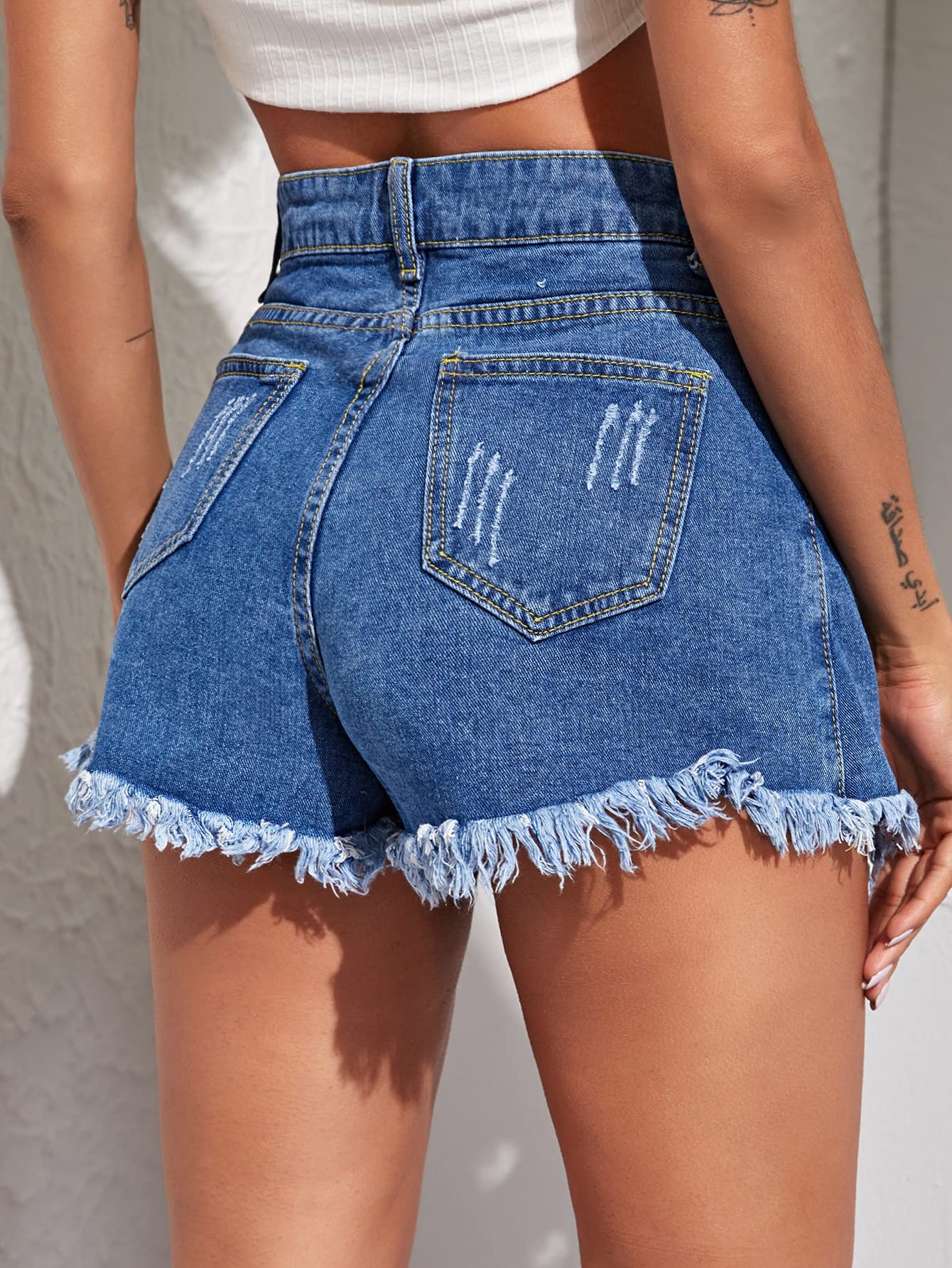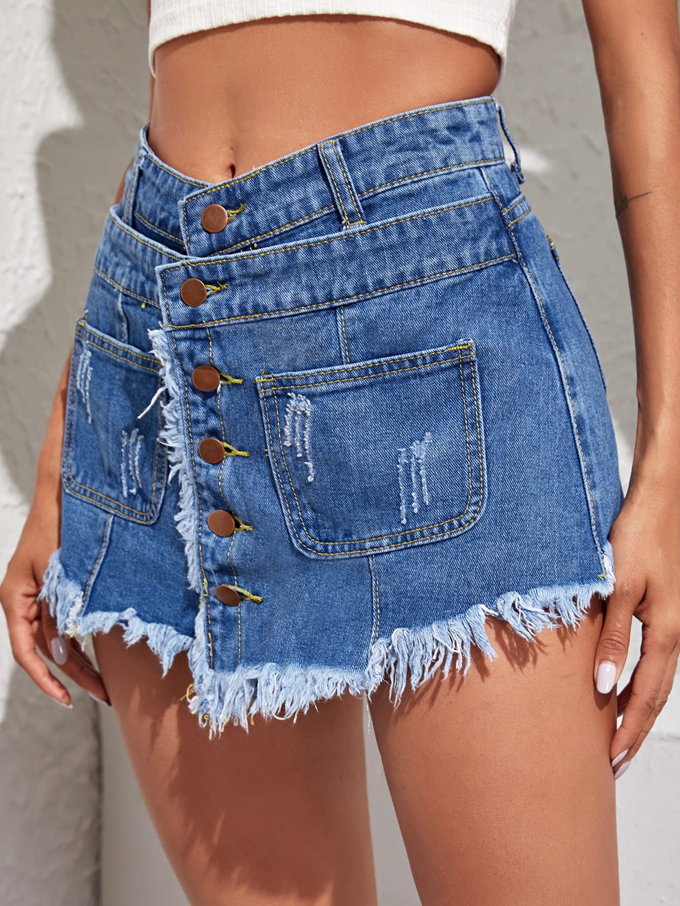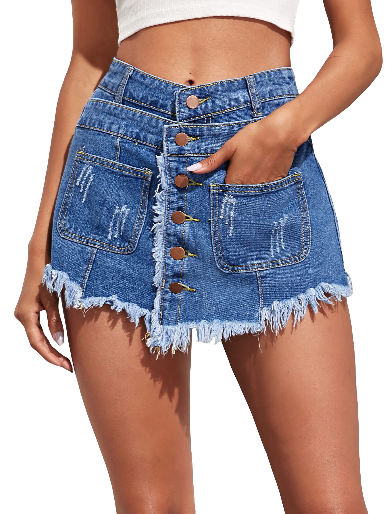 Floerns Women's Distressed Frayed High Waist Raw Hem Denim Skirt Shorts Blue L