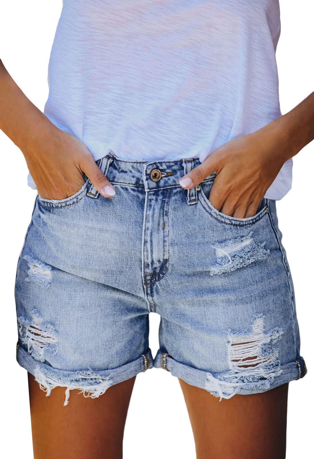 • Womens distressed ripped denim shorts features empire waist, mid-high rise, tummy control, destroyed ripped hole, rolled frayed cut off hemline and moderate fit, washed fashion and trendy boyfriend style shorts bottom.